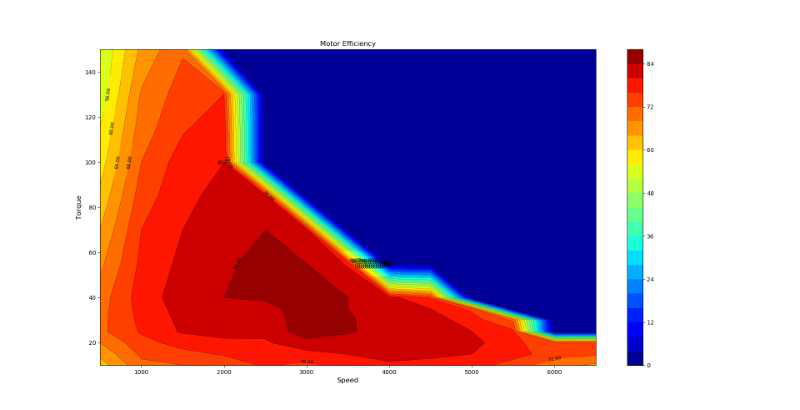 電力驅(qū)動(dòng)系統(tǒng)是電動(dòng)車的心臟,其性能的優(yōu)劣會(huì)直接影響電動(dòng)車的整車性能,內(nèi)置式電驅(qū)系統(tǒng)功率密度大,驅(qū)動(dòng)效率高。高效的MAP圖對樣機(jī)的設(shè)計(jì)及整車的性能分析提供了數(shù)據(jù),通過電機(jī)的外特性及負(fù)荷特性的測試數(shù)據(jù),會(huì)自動(dòng)生成效率MAP圖。