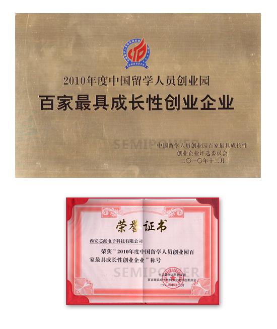 2010年度中國留學(xué)人員創(chuàng)業(yè)園百家最具成長性創(chuàng)業(yè)企業(yè)評審會議于2010年11月12日至11月13日在北京舉行。來自留學(xué)人員創(chuàng)業(yè)園、留學(xué)人員回國服務(wù)機(jī)構(gòu)、風(fēng)險投資機(jī)構(gòu)、專業(yè)研 究機(jī)構(gòu)、新聞媒體組成的評審委員會對申報(bào)企業(yè)進(jìn)行了初審、復(fù)審和通審,最終確定83家企業(yè)入圍。西安芯派電子科技有限公司入圍,榮獲“2010年度中國留學(xué)人員創(chuàng)業(yè)園百家最具成長性創(chuàng)業(yè)企業(yè)”稱號。