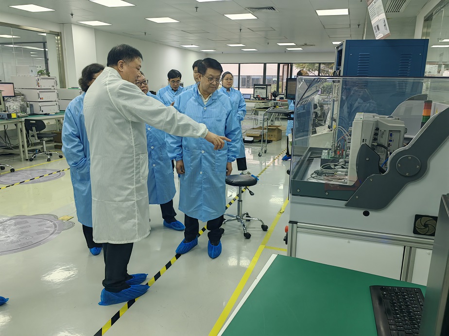 來賓一行參觀了芯派半導體功率器件測試應用中心和芯派新能源汽車動力控制研究中心,并聽取了芯派科技董事長羅義關于公司發(fā)展規(guī)劃以及新建項目“芯派智能電源電驅系統(tǒng)創(chuàng)新中心”建設情況的匯報。