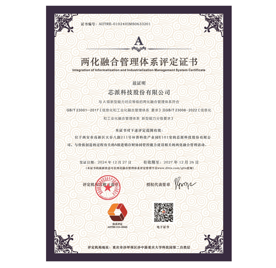 近日,芯派科技順利通過國家工業(yè)和信息化部GB/T23001-2017《信息化和工業(yè)化融合管理體系要求》及GB/T23006-2022《信息化和工業(yè)化融合管理體系新型能力分級要求》,獲得兩化融合管理體系評定證書,標(biāo)志著公司在數(shù)字化轉(zhuǎn)型道路上邁出了堅實的一步。