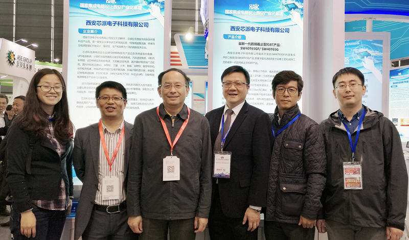 陜西省半導(dǎo)體行業(yè)協(xié)會理事長邱義路先生(左三)、秘書長何曉寧先生(左二)光臨芯派展臺并與芯派科技總裁羅義先生(左四)合影
