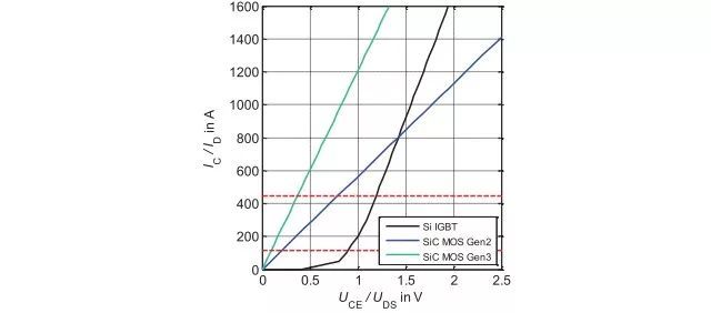 由于Si IGBT的導(dǎo)通壓降呈現(xiàn)二極管特性:即使導(dǎo)通電流很小,IGBT也有較大的初始導(dǎo)通壓降。而SiC MOSFET的導(dǎo)通壓降呈現(xiàn)電阻特性:其導(dǎo)通壓降與導(dǎo)通電流成正比。Si IGBT和SiC MOSFET兩種不同的導(dǎo)通壓降特性決定了只有在電流非常大時(shí),SiC MOSFET的導(dǎo)通損耗才會(huì)比Si IGBT高,而在大部分電流區(qū)間,SiC MOSFET的導(dǎo)通損耗要優(yōu)于Si IGBT。在整車(chē)工況中,大部分均為小電流工況,而大扭矩工況在整車(chē)路譜中的占比很小。而隨著SiC芯片技術(shù)的發(fā)展,未來(lái)SiC MOSFET的導(dǎo)通阻抗將全面優(yōu)于Si IGBT。