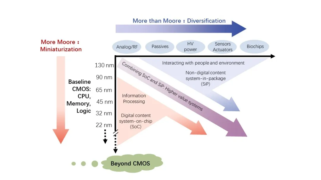 幸運(yùn)的是,每當(dāng)摩爾定律被唱衰將走到盡頭,總會激發(fā)出科學(xué)家和工程師們創(chuàng)新構(gòu)想,提出力挽狂瀾的突破性技術(shù),將看似走向終結(jié)的摩爾定律以“后摩爾定律”的形式延續(xù)下去?!昂竽柖伞钡膶嵸|(zhì)是,它除了會延續(xù)摩爾定律對集成度、性能的追求外,還會利用更多的技術(shù),例如模擬/射頻、高壓功率電源、MEMS傳感器、生物芯片技術(shù)及系統(tǒng)級封裝(SiP)等三維集成技術(shù),以提供具有更高附加值的系統(tǒng)。