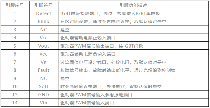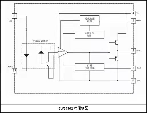 從SW57962的內(nèi)部原理功能框圖可以看出SW57962主要功能塊由四部分組成,分別是光耦隔離電路、過流檢測電路、門極關(guān)斷電路、延遲復(fù)位電路等單元組成。光耦隔離電路主要用于驅(qū)動(dòng)信號(hào)的電氣隔離及信號(hào)傳輸?shù)淖饔?;過流檢測電路用于IGBT過流信號(hào)的檢測,具體閾值可進(jìn)行外部調(diào)節(jié);門級(jí)關(guān)斷電路主要作用為異常條件下對(duì)IGBT驅(qū)動(dòng)進(jìn)行關(guān)斷,同時(shí)將該異常信號(hào)輸出反饋至控制級(jí);延遲復(fù)位電路主要用于故障信號(hào)去除后進(jìn)行延遲復(fù)位,使得驅(qū)動(dòng)信號(hào)恢復(fù)正常,達(dá)到軟開啟的效果。