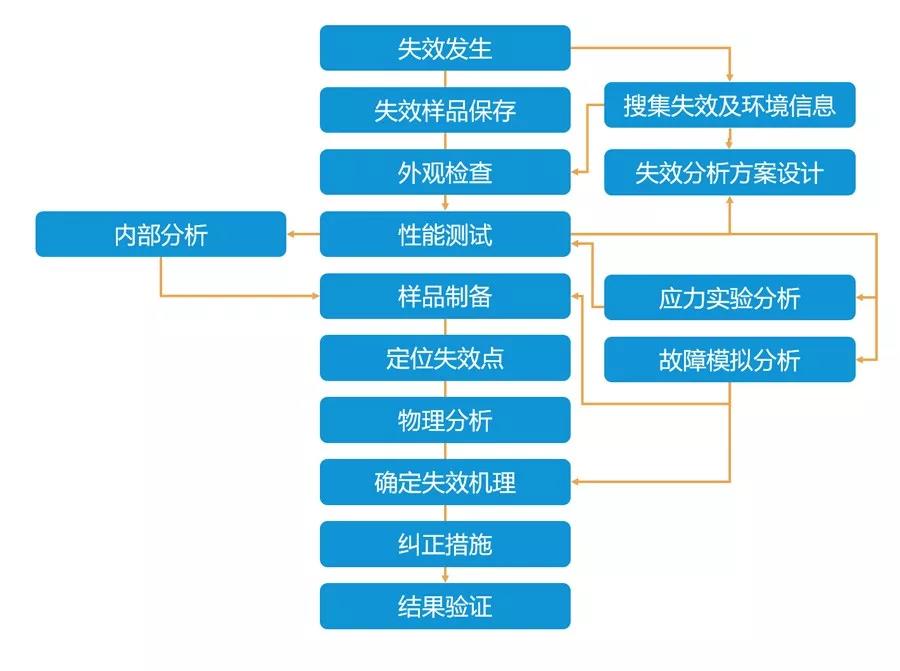 失效分析的原則是先進行非破壞性分析,后進行破壞性分析;先外部分析,后內(nèi)部(解剖)分析;先調(diào)查了解與失效的有關(guān)情況(電路、應(yīng)力環(huán)境條件、失效現(xiàn)象),后分析失效元器件。失效分析流程圖如下圖所示。